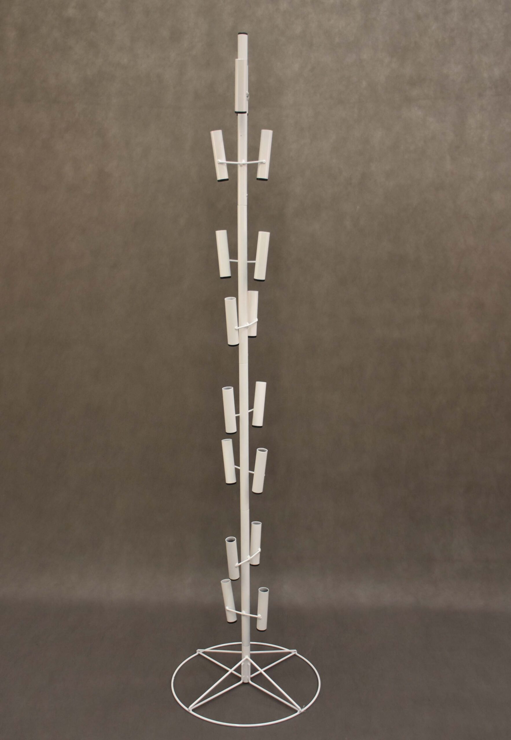 Oferowany stojak na balony został wykonany ze stali lakierowanej proszkowo i występuje wyłącznie w białym kolorze. Konstrukcja jest stabilna, ale wyjątkowo lekka. Składa się z podstawy w kształcie okręgu i czterech części zawierających specjalne uchwyty. W każdym z nich można umieścić po 4 balony na patyczku. Łącznie stojak może pomieścić nawet 64 balony! Stojak ma wysokość 180cm ale można dowolnie modyfikować jego wysokość przez zdejmowanie poszczególnych elementów.